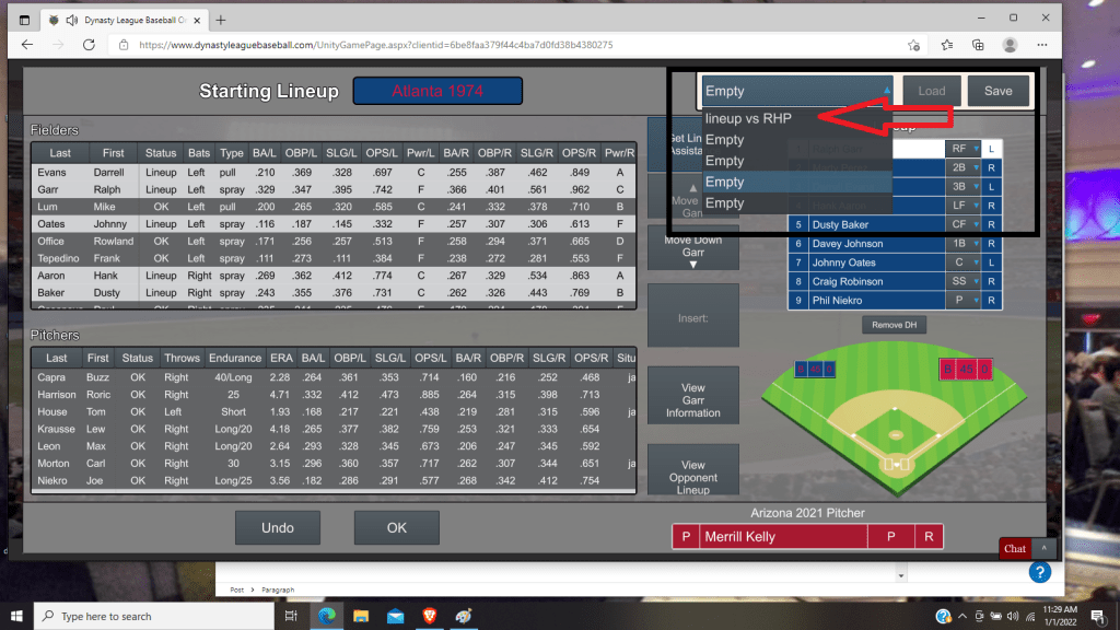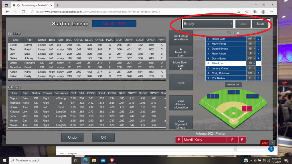 The nice thing about saving such a lineup is it becomes permanently available to you on the drop down list before each game.