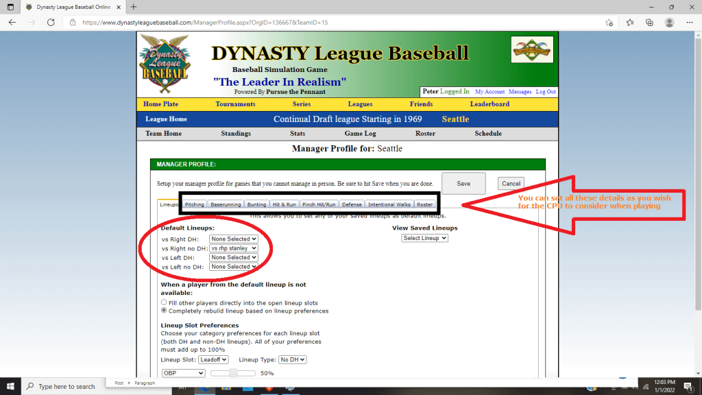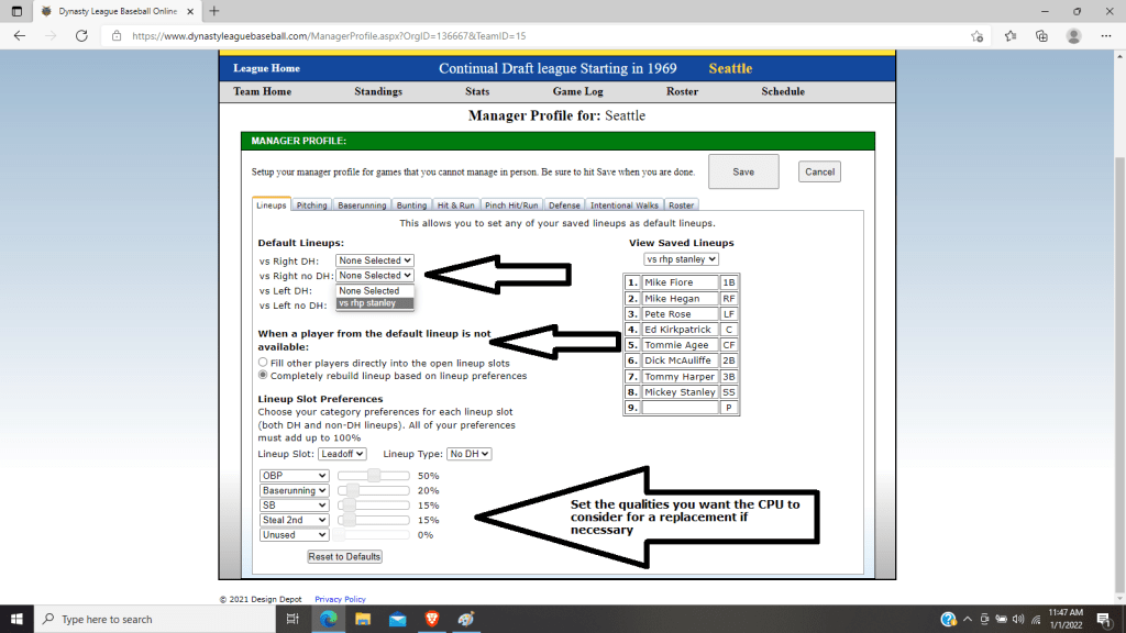 Now choose the situation you want your saved lineup to be used in. As you can see here Seattle has a lineup to use VS LHP. You can also choose what the system does in case one of the players in the saved lineup is not available. Either plug in another player in that spot or set preferences for various lineup spots if you want the PC to totally rebuild the lineup if someone is out.