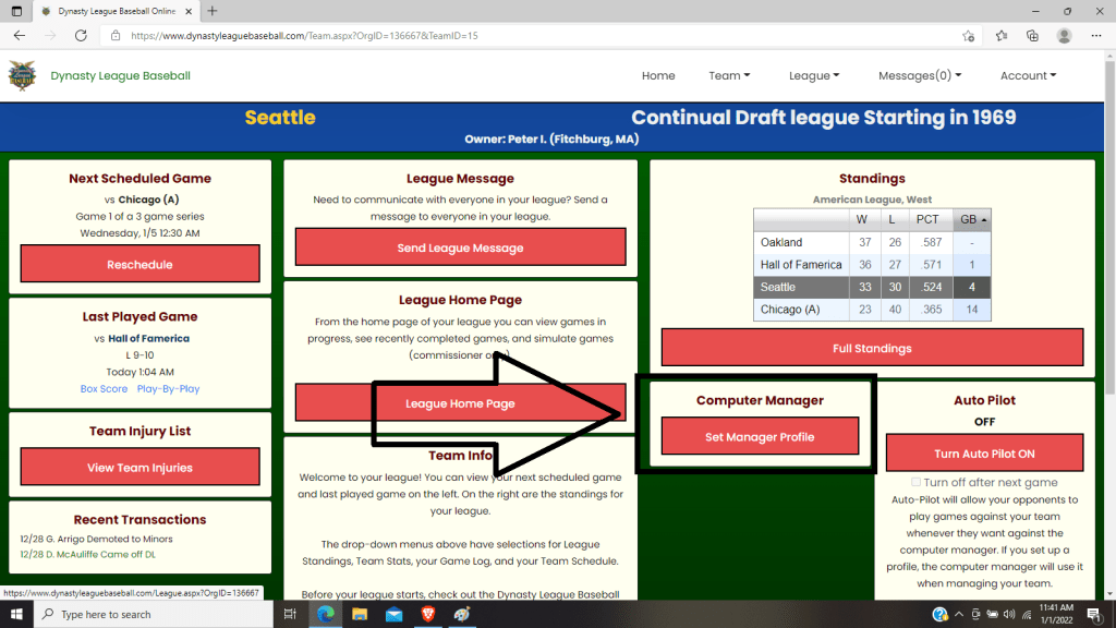 Just below the standings is a button that says “Select Manager Profile” click on it.