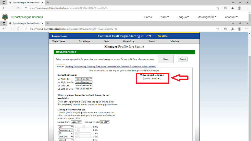 This will take you to the 1st page of the manager profile section which is lineups. To see the saved lineups you have available click on Saved Lineups: